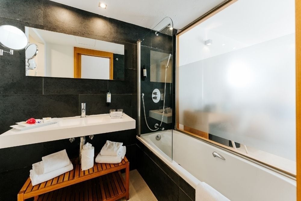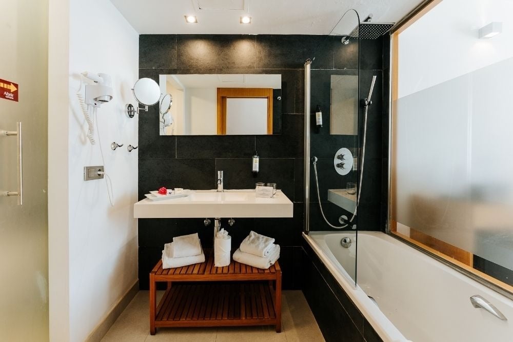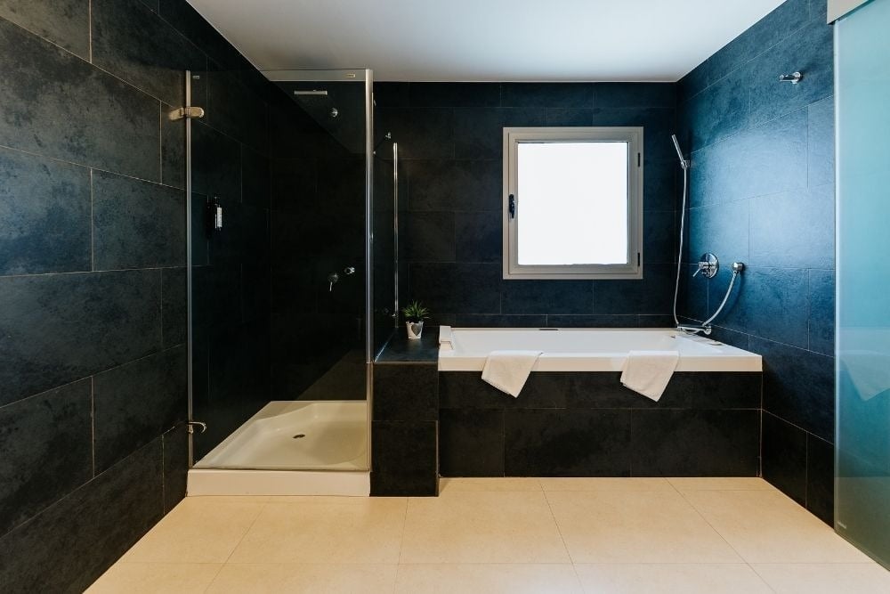 Salle de bain complète avec douche et baignoire balnéo